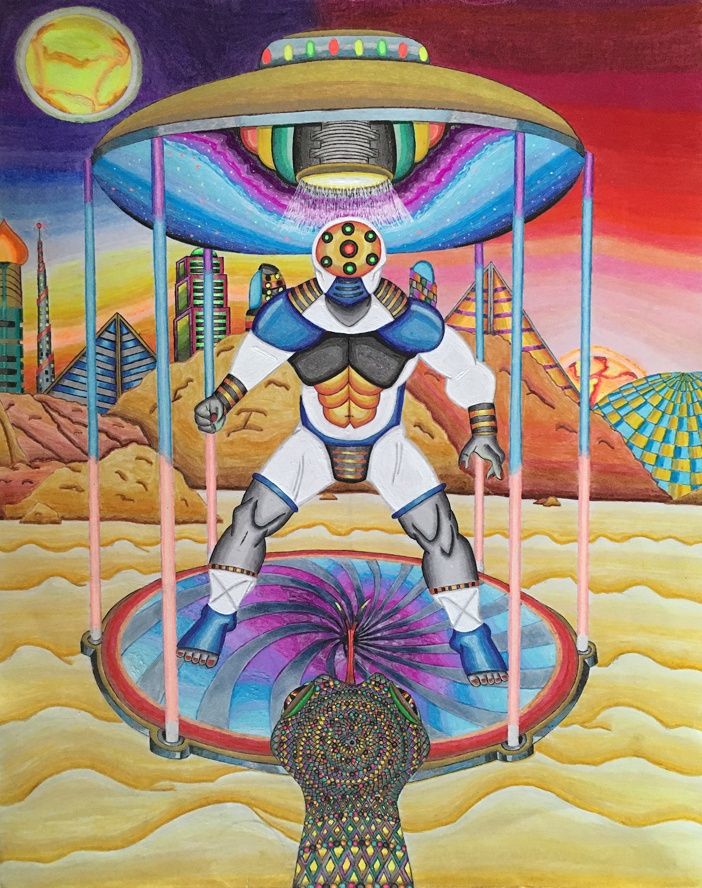 The pieces Ferguson created have become the basis of an incredible series. These works have been mostly executed during quiet moments at his job as a cashier at the Upper Valley Co-op in White River Junction, Vermont. Ferguson’s artistic background is entirely self-directed, mining an active imagination and pulling influence from sources as wide ranging as Caribbean / Yoruba culture, 20th century science fiction, and contemporary comic book characters.